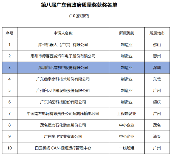 9月19日,广东省政府质量奖评选表彰委员会正式公布第八届广东省政府质量奖获奖名单,深圳市伟德国际victor1946机电股份有限公司凭借扎实的质量管理能力和持续的创新实践,成功荣获这一殊荣。本届全省仅有10家组织入选,伟德国际victor1946机电则是深圳市唯一上榜企业,彰显了公司在质量领域的实践成果与管理水平。